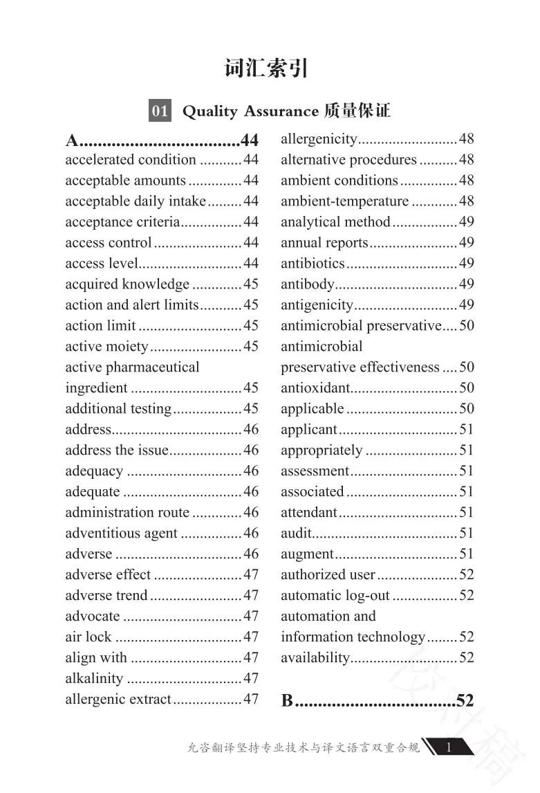 為方便不同崗位人員的學(xué)習(xí)需求,本書(shū)特按照質(zhì)量保證(Quality Assurance)、監(jiān)測(cè)分析、設(shè)施設(shè)備(Facility & Equipment)、生產(chǎn)工藝(Production & Process)、注冊(cè)研發(fā)(Registration & R&D)五大部分對(duì)詞匯進(jìn)行分類(lèi),共計(jì)2000+專(zhuān)業(yè)詞匯。每一詞匯均包含中文、英文、英文音標(biāo)、詞匯應(yīng)用例句,是制藥人士必備的專(zhuān)業(yè)“應(yīng)用詞典”。