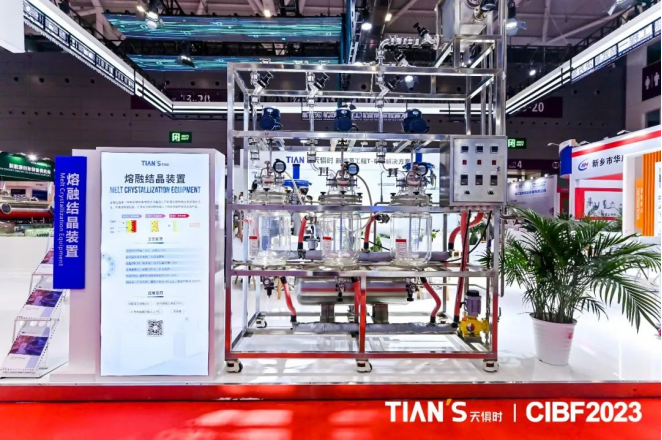 合而共贏,方能健步前行。在本次展會(huì)中,天俱時(shí)集團(tuán)展位還展出了戰(zhàn)略合作伙伴重慶敏恒科技有限公司所帶來的熔融結(jié)晶裝置與分子蒸餾裝置。其中,熔融結(jié)晶裝置相較于傳統(tǒng)列管結(jié)晶可節(jié)省占地面積與投資成本,提升效率,并且產(chǎn)品純度最高可達(dá)99.9999%,廣泛應(yīng)用于VC/FEC等添加劑領(lǐng)域。分子蒸餾裝置可使液體在遠(yuǎn)低于沸點(diǎn)的溫度下分離,并且受熱時(shí)間短,分離程度高,可做到連續(xù)流,特別適用于熱敏性物質(zhì)的蒸餾提純。